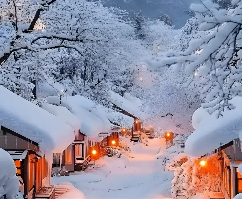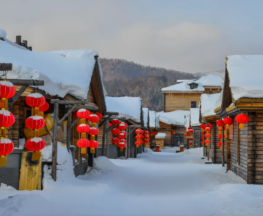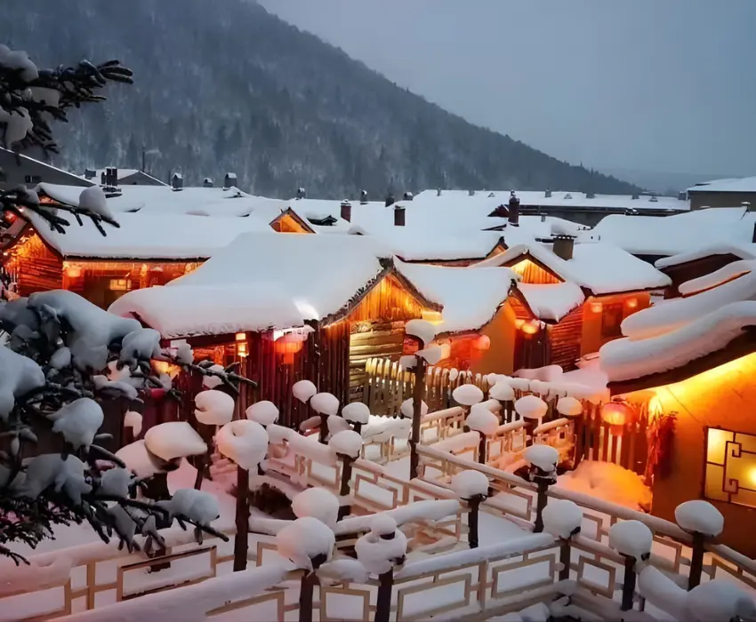 - Thị trấn Tuyết Trung Quốc với kiến trúc cổ kính và không gian phủ tuyết trắng xóa.