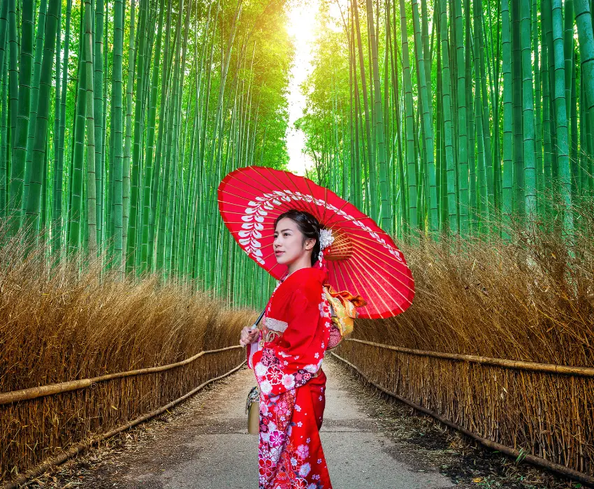 - Rừng trúc Sagano, ngoại ô thành cổ Kyoto (Nhật Bản), khung cảnh những thân cây xanh như ngọc lục bảo cao ngút tầm mắt lắc lư theo gió, cùng tiếng lá xào xạc như lời thì thầm của tự nhiên, kể lại những câu truyện cổ tích làm tâm hồn du khách trở nên tĩnh lặng và thư thái.