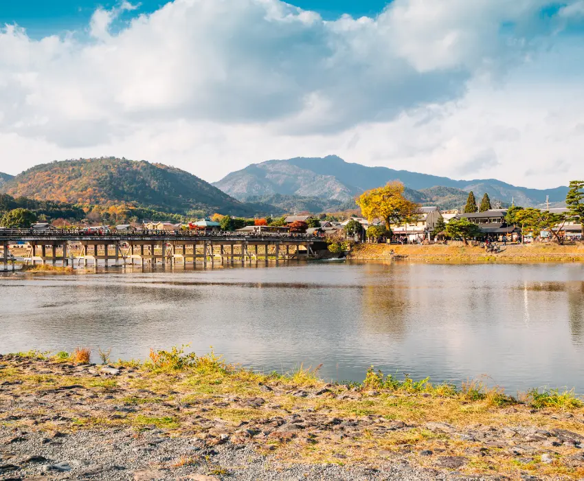 - Tham quan cầu cổ Togetsu-kyo, ban đầu được xây dựng bởi nhà sư Dosho - đệ tử của cao tăng Kuhai, vào thời Thừa Hòa (834 ~ 848) (đầu thời kì Heian). Cây cầu lúc bấy giờ nằm ở phía thượng nguồn so với ví trị hiện tại. Trải qua nhiều lần bị thiêu hủy và hư hại do lũ lụt, cây cầu được dời về vị trí hiện tại vào năm 1606.