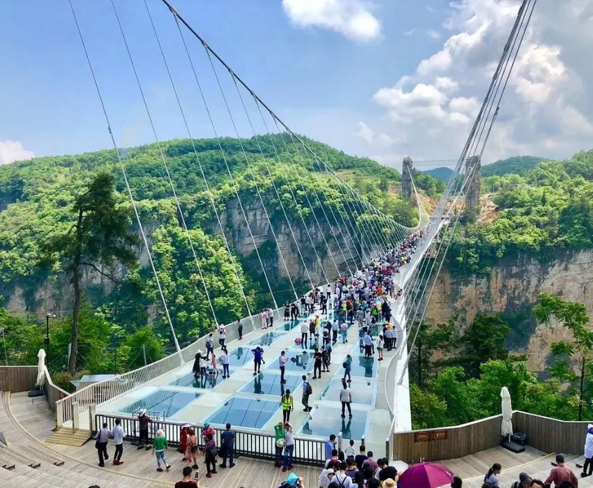 - Quý khách có thể trải nghiệm tham quan Cầu Kính Đại Hiệp Cốc - cây cầu kính cao và dài nhất thế giới, đứng trên cầu có thể ngắm nhìn toàn cảnh đáy thung lũng sâu 400 m. Quý khách sẽ được sử dụng lối đi thang máy, kèm theo gói quà tặng “Công nghệ thực tế ảo VR” trải nghiệm cảm giác ngồi trên khinh khí cầu du ngoạn thưởng thức cảnh sắc Đại Hiệp Cốc và Cầu Kính Trương Gia Giới (Chi phí tự túc).