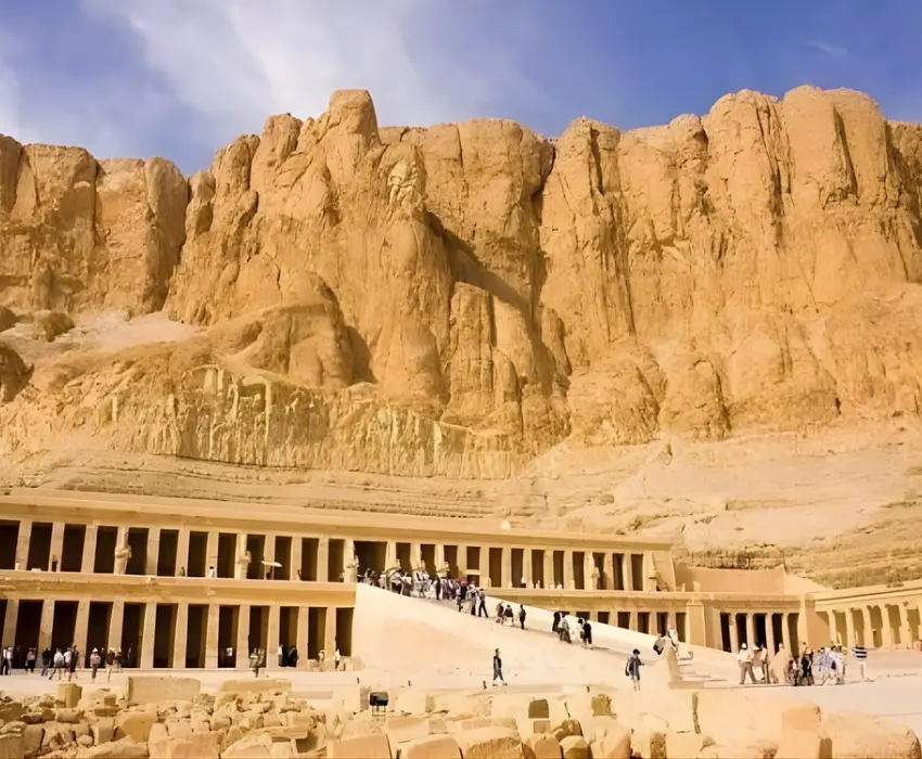 - Đền thờ Hatshepsut – kiến trúc vĩ đại của vị nữ Pharaoh duy nhất trong lịch sử Ai Cập cổ đại, được xây dựng hòa hợp vào vách núi đá tự nhiên.