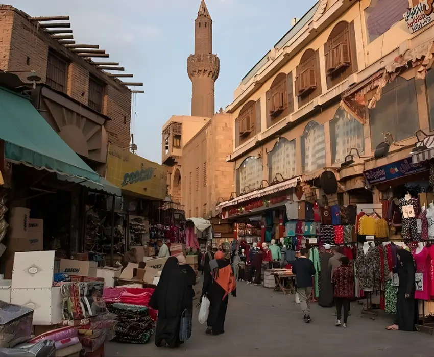 - Khu phố cổ Khan El-Khalili – khu chợ lâu đời nhất Cairo. Quý khách có thể chọn mua tinh dầu, tượng đá, khăn sa mạc, trang sức bạc, hay đơn giản là thưởng thức một ly trà bạc hà trong quán cà phê cổ giữa phố Hồi giáo sầm uất.