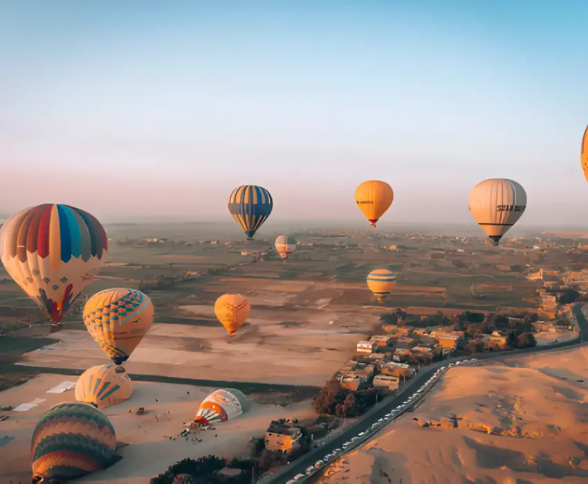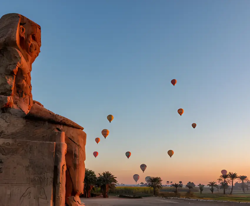 04h30: (Lựa chọn tự túc): Quý khách có thể tham gia trải nghiệm bay khinh khí cầu ngắm bình minh trên Luxor – một trong những trải nghiệm đáng nhớ nhất tại Ai Cập. Khi những tia nắng đầu tiên vừa rạng lên từ sau dãy núi phía Đông, khinh khí cầu nhẹ nhàng nâng bạn lên bầu trời. Từ độ cao 300–500m, khung cảnh toàn bộ Luxor hiện ra trong vẻ đẹp huyền thoại: sông Nile xanh thẫm uốn lượn, các cánh đồng xanh mướt hai bên bờ, những mái đền, tháp đá, lăng mộ và tượng đài ẩn hiện trong sương sớm – một trải nghiệm tuyệt diệu mà không một khung hình nào có thể diễn tả trọn vẹn.