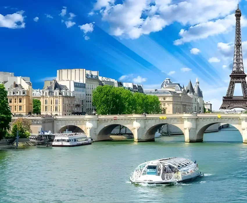 - Trải nghiệm du thuyền sông Seine để ngắm nhìn những công trình kiến trúc nổi tiếng như Tháp Eiffel, Nhà thờ Đức Bà, Cầu Alexandre III, và Bảo tàng Louvre kết hợp bữa tối sang trọng trên du thuyền đẳng cấp mang đậm phong cách Châu Âu.