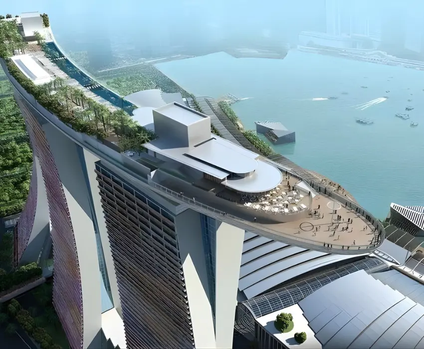 - Công Viên Sands SkyPark nằm trên đỉnh của ba tòa tháp khách sạn Marina Bay Sands với hình dạng "Chiếc du thuyền" lơ lửng ở trên tầng 57 với độ cao 200m. (chi phí tự túc).