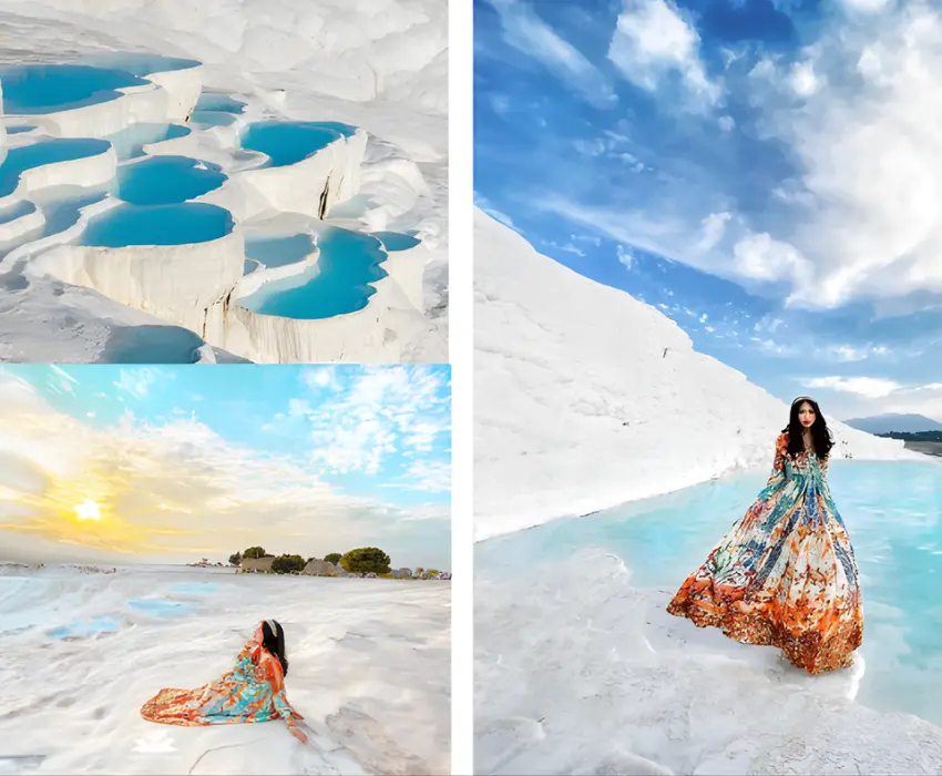 - Pamukkale – "Lâu đài Bông Trắng" là một trong những kỳ quan thiên nhiên độc đáo nhất Thổ Nhĩ Kỳ, được UNESCO công nhận là Di sản Thế giới. Những tầng thác đá vôi trắng muốt xếp lớp như bậc thang, bên trong là các hồ nước khoáng màu xanh ngọc bích óng ánh. Vào lúc hoàng hôn, cả Pamukkale chìm trong ánh vàng cam dịu dàng, phản chiếu trên mặt nước và các bậc thang đá, tạo nên một khung cảnh huyền ảo khiến du khách không thể rời mắt