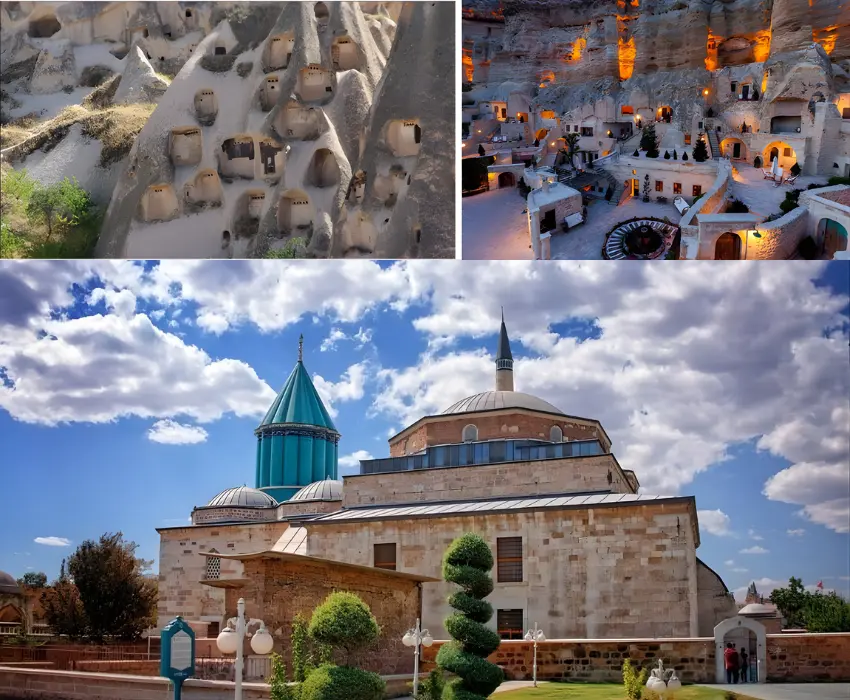 - Tu viện Mevlana – công trình kiến trúc Hồi giáo nổi bật với mái vòm màu xanh ngọc, nơi lưu giữ thi hài của Rumi và các hiện vật Hồi giáo cổ.
