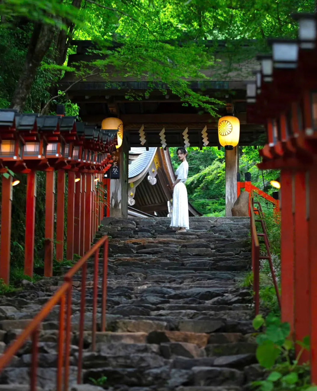 Đền Kibune: Những chiếc lồng đèn vàng ấm, cổng torii đỏ, rừng xanh mướt và các bàn ăn ven suối (kawadoko) — khung cảnh như bước ra từ phim ảnh.