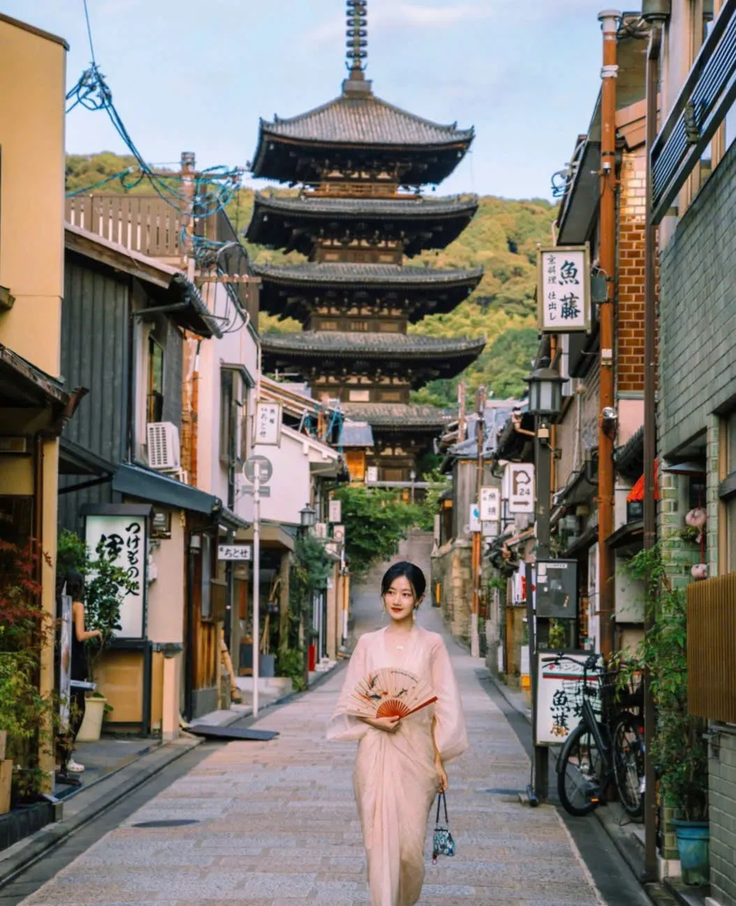 Tháp Yasaka: Đi theo chỉ dẫn đến “Kyoto Mizuiro-tei”, con đường này ít người, tháp năm tầng lấp ló sau những phố xưa, rất có cảm giác lịch sử;