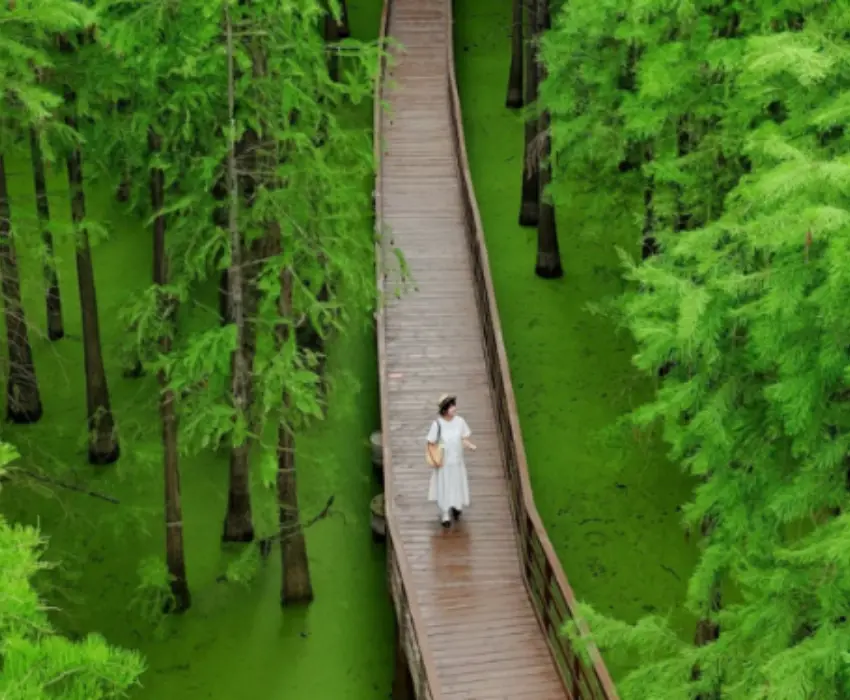 - Khu sinh thái ngập nước Đầm Thanh Sơn – Nằm cách trung tâm Hàng Châu khoảng 40km, đầm lầy Thanh Sơn được mệnh danh là “tiểu Cửu Trại Câu” của Chiết Giang. Đi thuyền xuyên qua những lối mòn ngập nước, du khách như lạc vào một mê cung xanh mát, chiêm ngưỡng cảnh sắc sông nước – rừng cây đan xen kỳ thú.