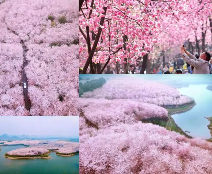Lưu ý: Thời gian hoa anh đào nở dự kiến từ 20/3 đến 28/3; hoa đỗ quyên nở dự kiến trong tháng 4. Nếu không thể tham quan do điều kiện thực tế, đoàn sẽ đổi sang tham quan Thiên Long Đồn Bảo (bao gồm xe điện sinh thái + biểu diễn kịch Địa hí). Thời gian nở hoa không thể dự đoán chính xác, mong quý khách thông cảm.