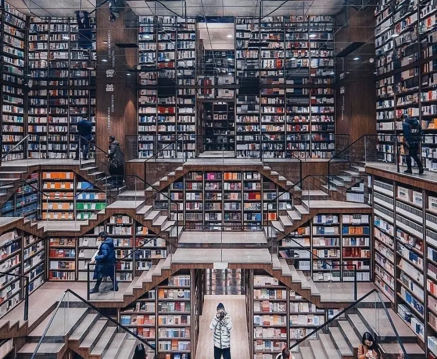 - Check-in tại Chung Thư Các: Là chuỗi hiệu sách nổi tiếng tại Trung Quốc, được mệnh danh là “hiệu sách đẹp nhất thế giới” nhờ thiết kế kiến trúc độc đáo và ấn tượng. Bên trong không gian sách là những đường cong gương phản chiếu, trần nhà uốn lượn và giá sách cao vút tạo cảm giác như bước vào một thư viện nghệ thuật.